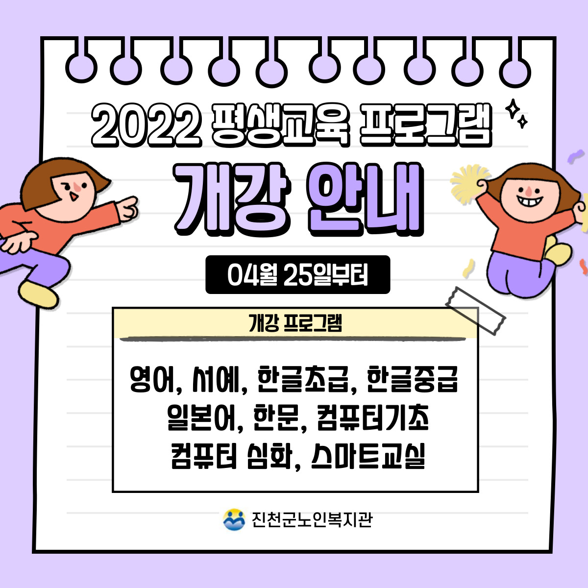 <2022³â Æò»ý±³À°ÇÁ·Î±×·¥ °³° ¾È³»> º¹Áö°ü ¿î¿µ Àç°³¿¡ µû¶ó 4/25(¿ù)ºÎÅÍ Æò»ý±³À°ÇÁ·Î±×·¥ÀÌ °³°ÇÏ°Ô µÇ¾úÀ½À» ¾È³»µå¸³´Ï´Ù. ÇнÀÀ§ÁÖÀÇ ÇÁ·Î±×·¥ºÎÅÍ ¿ì¼±ÀûÀ¸·Î ºÎºÐ °³°ÇÏ°Ô µÇ¸ç, ÀÌ ¿Ü¿¡ ÇÁ·Î±×·¥Àº ´Ü°èÀûÀ¸·Î °³°ÇÒ ¿¹Á¤ÀÌ¿À´Ï Á¶±Ý¸¸ ±â´Ù·Á ÁÖ½Ã¸é °¨»çÇϰڽÀ´Ï´Ù! ¸ðµÎ ºÉ ¼ö ÀÖ´Â ³¯À» ¼Õ²Å¾Æ ±â´Ù¸³´Ï´Ù¢¾ ¡Û ÃâÀÔ±âÁØ : Äڷγª19 ¹é½Å 3Â÷ Á¢Á¾¿Ï·áÀÚ ¡Û °æ·Î½Ä´ç, °Ç°°ü¸®½Ç ¹Ì¿î¿µ ¡Û ¹®ÀÇ : ¢Ï 070-4047-6054