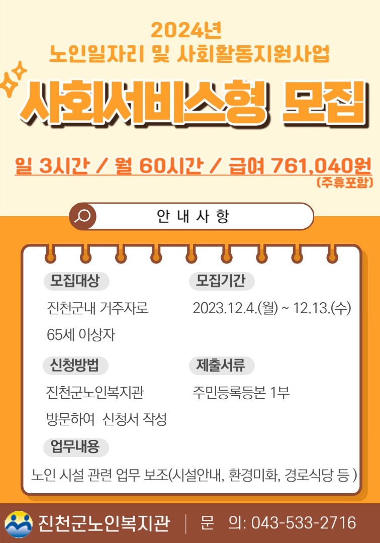 ÁøÃµ±º³ëÀκ¹Áö°ü¿¡¼ 2024³â ³ëÀÎÀÏÀÚ¸® »çȸ¼ºñ½ºÇü Âü¿©ÀÚ¸¦ ¸ðÁýÇÕ´Ï´Ù.~!- ¸ðÁý´ë»ó: ÁøÃµ±º³» 65¼¼ ÀÌ»óÀÚ- ¸ðÁý±â°£: 2023.12.4.(¿ù) ~ 12.13.(¼ö)- ½Åû¹æ¹ý: ÁøÃµ±º³ëÀκ¹Áö°ü ¹æ¹®ÇÏ¿© ½Åû¼ ÀÛ¼º- Á¦Ãâ¼·ù: Áֹεî·Ïµîº» 1ºÎ- ¾÷¹«³»¿ë: ³ëÀνü³ °ü·Ã ¾÷¹« º¸Á¶(½Ã¼³¾È³», ȯ°æ¹ÌÈ, °æ·Î½Ä´ç µî)