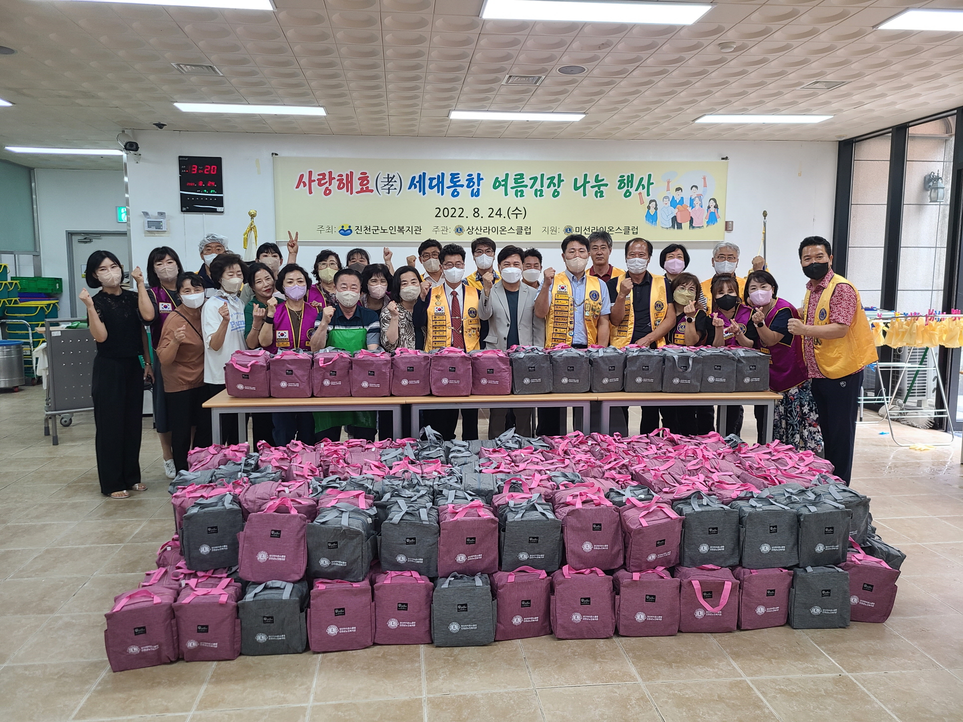 ±¹Á¦¶óÀ̿½ºÇùȸ 356-D(ÃæºÏ)Áö±¸ »ó»ê¶óÀ̿½ºÅ¬·´(ȸÀå ¹Ú¿ëÀÍ)Àº 24ÀÏ ÁøÃµ±º³ëÀκ¹Áö°ü °æ·Î½Ä´ç¿¡¼ '»ç¶ûÇØÈ¿(üø) ¼¼´ë ÅëÇÕ ¿©¸§ ±èÀå ³ª´® Çà»ç'¸¦ ½Ç½ÃÇß´Ù.À̳¯ ³ª´® Çà»ç¿¡´Â ÃæºÏÁö±¸ ÃÖ¿µ±¹ ÃÑÀç¿Í 9Áö¿ª ÁøÃµ »ó»ê¶óÀ̿½ºÅ¬·´°ú ¹Ì¼±¶óÀ̿½ºÅ¬·´(ȸÀå ±è¿µÀÚ) ȸ¿ø°ú ÁøÃµ±º Çб³ ¹Û û¼Ò³â Áö¿ø¼¾ÅÍ(¼¾ÅÍÀå ¹èÀÌÁ¤) û¼Ò³â, ³²¼º Ȧ¸ö ¾î¸£½Å µî 50¿© ¸íÀÌ Âü¿©Çß´Ù.Áö¿ª ºÀ»ç´ÜüÀÎ »ó»ê¶óÀ̿½ºÅ¬·´ ÁÖ°üÀ¸·Î ¸¶·ÃµÈ Çà»ç´Â Çб³ ¹Û û¼Ò³â°ú ³²¼º Ȧ¸ö ¾î¸£½Å, ¶óÀ̿½ºÅ¬·´ ȸ¿ø µî 1¡¤3¼¼´ë°¡ ÇÔ²² ¿©¸§ ±èÀå ±èÄ¡¿Í ¹Ø¹ÝÂù 300¸íºÐÀ» ¸¸µé¾î Àü´ÞÇϱâ À§ÇØ ¸¶·ÃµÆ´Ù.À̳¯ »ó»ê¶óÀ̿½ºÅ¬·´Àº ÁøÃµ±º³ëÀκ¹Áö°ü°ú ¾î¸£½ÅµéÀÇ °Ç°ÇÑ »ýȰ°ú Çູ ÁõÁøÀ» À§ÇØ ¼·Î Çù·ÂÇϱâ·Î ÇÏ´Â ¾÷¹«Çù¾àµµ ü°áÇß´Ù.¹Ú¿ëÀÍ È¸ÀåÀº "Áö¿ª °øµ¿Ã¼ Ȱ¼ºÈ¸¦ À§ÇØ È¸¿øµé°ú ÇÔ²² Ŭ·´ ¿¬·Ê Çà»ç·Î ¼¼´ë ÅëÇÕ ±èÀå ³ª´® Çà»ç¸¦ °®°Ô µÆ´Ù"¸ç "³ëÀκ¹Áö ÁõÁøÀ» À§ÇØ ´õ¿í ³ë·ÂÇϰڴÙ"°í ¸»Çß´Ù.
