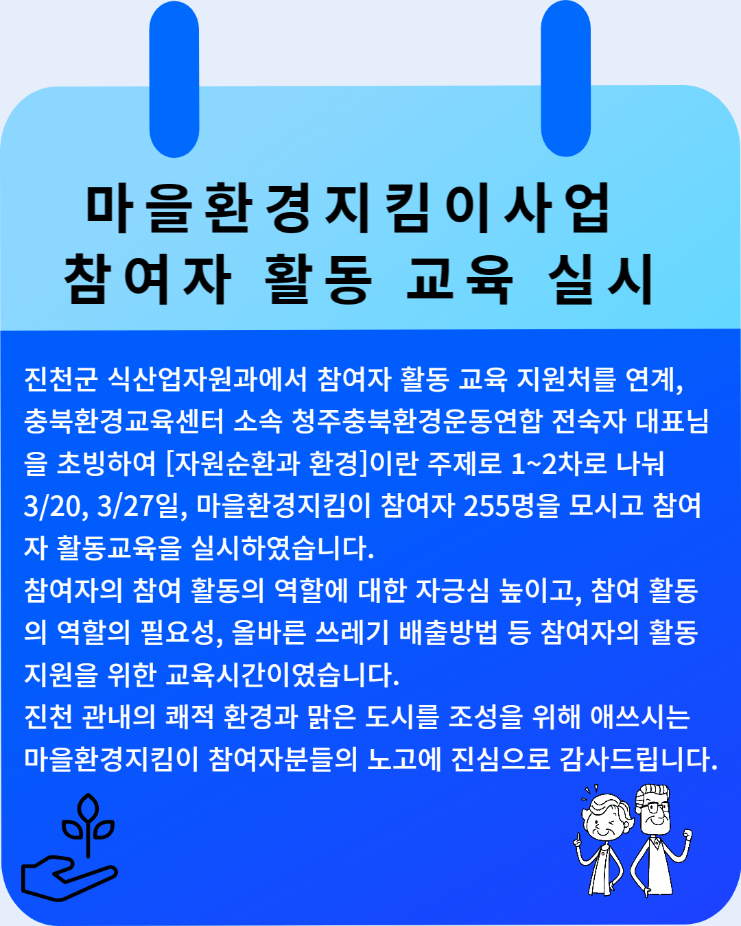 ÁøÃµ±º ½Ä»ê¾÷ÀÚ¿ø°ú¿¡¼ Âü¿©ÀÚ È°µ¿ ±³À° Áö¿øÃ³¸¦ ¿¬°è, ÃæºÏȯ°æ±³À°¼¾ÅÍ ¼Ò¼Ó ûÁÖÃæºÏȯ°æ¿îµ¿¿¬ÇÕ Àü¼÷ÀÚ´Ô ´ëÇ¥À» ÃʺùÇÏ¿© [ÀÚ¿ø¼øÈ¯°ú ȯ°æ]À̶õ ÁÖÁ¦·Î 1~2Â÷·Î ³ª´² 3/20, 3/27ÀÏ, ¸¶À»È¯°æÁöÅ´ÀÌ Âü¿©ÀÚ 255¸íÀ» ¸ð½Ã°í Âü¿©ÀÚ È°µ¿±³À°À» ½Ç½ÃÇÏ¿´½À´Ï´Ù.