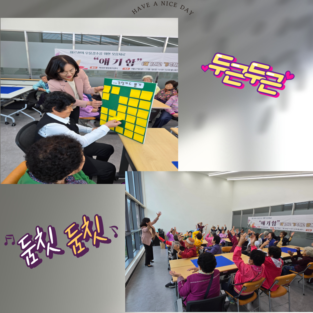¿ì¿ï°¨ÇؼҸ¦ À§ÇÑ ¿ì¿ïÇÁ·Î±×·¥ ¿ôÀ½Ä¡·á"¾ê±âÇÔ" (¾ê±âÇÏ°í ±â¾ïÇϰí ÇÔ²²Çϰí)10.11(±Ý) 2ȸ±â¿¡´Â ¹é°î¸é ÇàÁ¤º¹Áö¼¾ÅÍ¿¡¼ ½Ã´Ï¾î ÀÎÁöº¸µå ÇÁ·Î±×·¥À» ÁøÇàÇÏ¿´½À´Ï´Ù.°íÇǽ¬ °¨Á¤Ä«µå·Î ³ª¿¡ °¨Á¤°ú À̾߱⸦ ²ø¾î³»°í ºù°íŰƮ, µ¥Ä®ÄÚ º¸µå µå·ÎÀ×À¸·Î ±×¸²µµ ±×·Áº¸´Â Áñ°Å¿î ½Ã°£ÀÌ¿´½À´Ï´Ù.°¢ Á¶°¡ ÈûÀ» ÇÕÃÄ Çùµ¿º¸µå¸¦ ÅëÇØ »çȸÀû »óÈ£ÀÛ¿ë ±â¼ú Çâ»ó°ú »óÈ£ Ä£¹Ð°¨À» Çü¼ºÇÏ¿© ¿ì¿ïÁõÀ» ¿¹¹æÇÏ´Â ÇÁ·Î±×·¥À» ÅëÇØ Çູ°¨À» ³ôÀÌ´Â Áñ°Ì°í ÇູÇÑ ÇÏ·ç¿´½À´Ï´Ù.