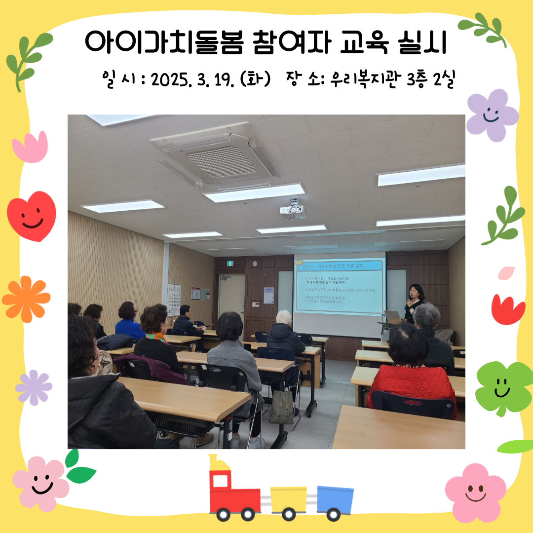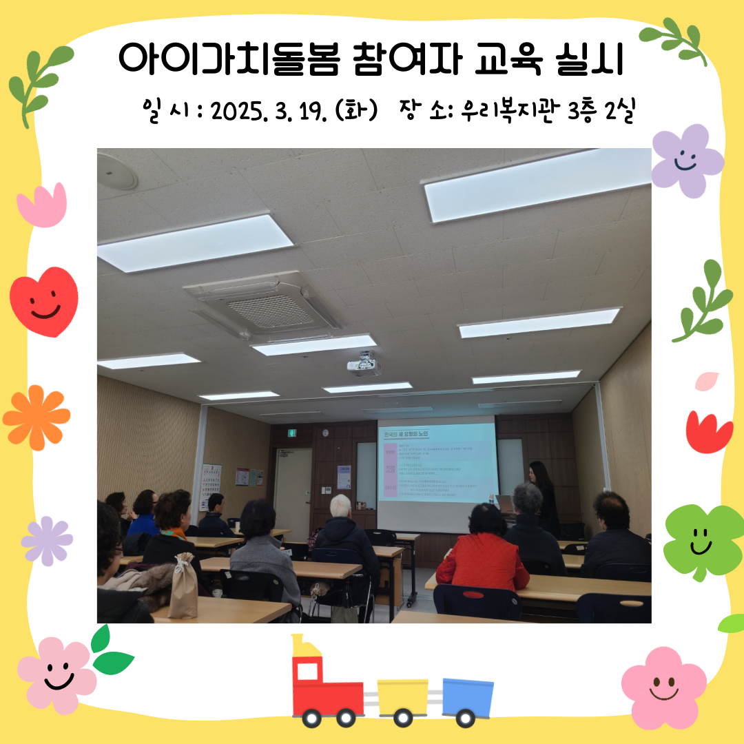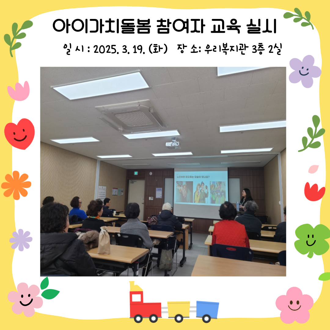 2025³â 3¿ù 19ÀÏ(È) ³ëÀοª·®È°¿ë»ç¾÷ ¾ÆÀ̰¡Ä¡µ¹º½ Âü¿©ÀÚ 16¸íÀ» ¸ð½Ã°í ¼Ò¾ç ±³À°À» ÁøÇàÇÏ¿´½À´Ï´Ù.