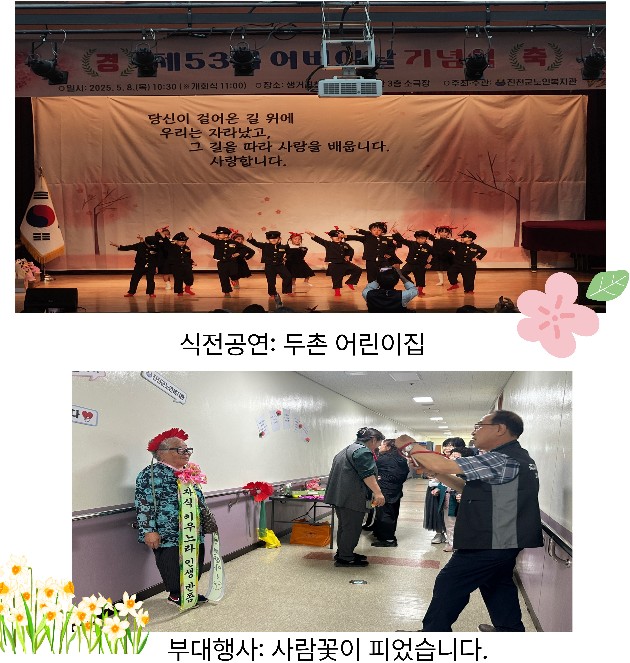 <Á¦53ȸ ¾î¹öÀ̳¯ ±â³ä½Ä>-ÀϽÃ: 2025.5.8.(¸ñ) 11:00(¡Ø½ÄÀü°ø¿¬ 10:30)-Àå¼Ò: »ý°ÅÁøÃµÁ¾ÇÕ»çȸº¹Áö°ü2025³â Á¦53ȸ ¾î¹öÀ̳¯ ±â³ä½ÄÀÌ »ý°ÅÁøÃµÁ¾ÇÕ»çȸº¹Áö°ü¿¡¼ ÁøÃµ±º³ëÀκ¹Áö°ü(°üÀå ÀÌÁ¾¿í)ÀÇ ÁÖ°üÀ¸·Î ¿·È½À´Ï´Ù.ºÎ´ë Çà»ç·Î ÁøÃµ±ºÇⱺ¿©¼ºÈ¸¿¡¼ ±â³ä½Ä¿¡ Âü¼®ÇÑ ¾î¸£½Åµé²² Ä«³×À̼ÇÀ» ´Þ¾Æµå·È°í, Àΰ£Èȯ ±â³äÃÔ¿µ µîÀ¸·Î ´Ùä·Ó°Ô ¿î¿µÀÌ µÇ¾ú½À´Ï´Ù.±×¸®°í ´ö»êÀ¾ µÎÃ̾ÀÌÁý ¾ÆÀ̵éÀÌ ½ÄÀü°ø¿¬À¸·Î °ËÁ¤°í¹«½Å°ú, »ç¶ûÀÇ Æ®À§½ºÆ® À½¾Ç¿¡ ¸ÂÃç ±ôÂïÇÑ À²µ¿À» ÇØ¼ ¾î¸£½ÅµéÀÇ ¸¹ÀÌ Áñ°Å¿öÇϼ̽À´Ï´Ù.¶Ç °¡Á·ÀÇ ´ÞÀ» ¸ÂÀÌÇØ '¾Æ¹öÁö'¶ó´Â ÁÖÁ¦·Î ±ä ¼¼¿ù ¹¬¹¬È÷ ÀÏÇØ¾ß¸¸ Çß´ø, ±×·¡¼ °¡Á·µé¿¡°Ô Ç¥ÇöÀÌ ¼Åø ¼ö ¹Û¿¡ ¾ø¾ú´ø ¾Æ¹öÁöµéÀ» À§ÇÑ µ¿¿µ»óÀ» Á¦ÀÛÇÏ°í »ó¿µÇØ Âü¼®ÇϽŠ¾î¸£½ÅµéÀÇ °¨µ¿À» ÀھƳ½À´Ï´Ù.À̹ø ½Ä¿¡¼ È¿ÇàÀÚ, ÀåÇѾî¹öÀÌ, ³ëÀκ¹Áö ±â¿©ÀÚ¿¡ ´ëÇÑ Ç¥Ã¢°ú °¡Á¤ÀÇ ´Þ °È±â´ëȸ Çà»ç¸¦ À§ÇÑ ±Ý¼º°³¹ß(ÁÖ)(´ëÇ¥ÀÌ»ç ½ÅÇöâ)ÀÇ ÈÄ¿ø±Ý Àü´Þ½ÄÀÌ À̾îÁ® ±â³ä½ÄÀÌ ¶æ±í¾ú½À´Ï´Ù.¿À´Ã Çà»ç¿¡ Âü¿©ÇØ ÁֽЏðµç ºÐµé²² °¨»çµå¸³´Ï´Ù.#ÁøÃµ±º³ëÀκ¹Áö°ü#Á¦53ȸ ¾î¹öÀ̳¯ ±â³ä½Ä