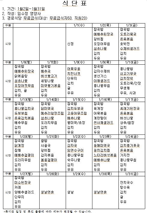 1¿ù Áß ¹æÇп¡´Â ¹«·á±Þ½ÄÀÚ ¾î¸£½Åµé¸¸ ±Þ½ÄÀ» Á¦°øÇÕ´Ï´Ù